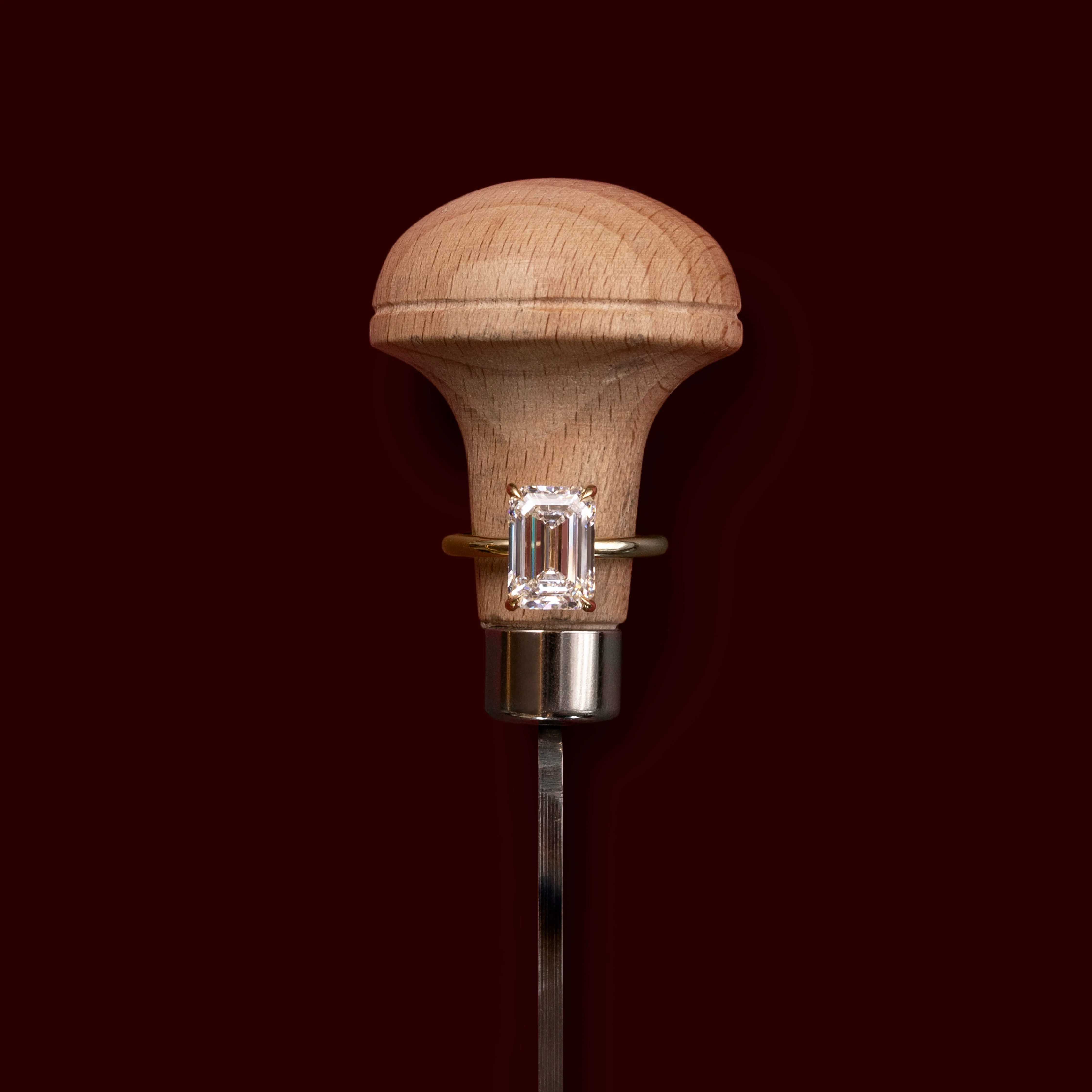 The Audrey Ring features a beautiful emerald cut lab-grown gemstone with step-cut faceting, elegantly presented in a divine basket setting.