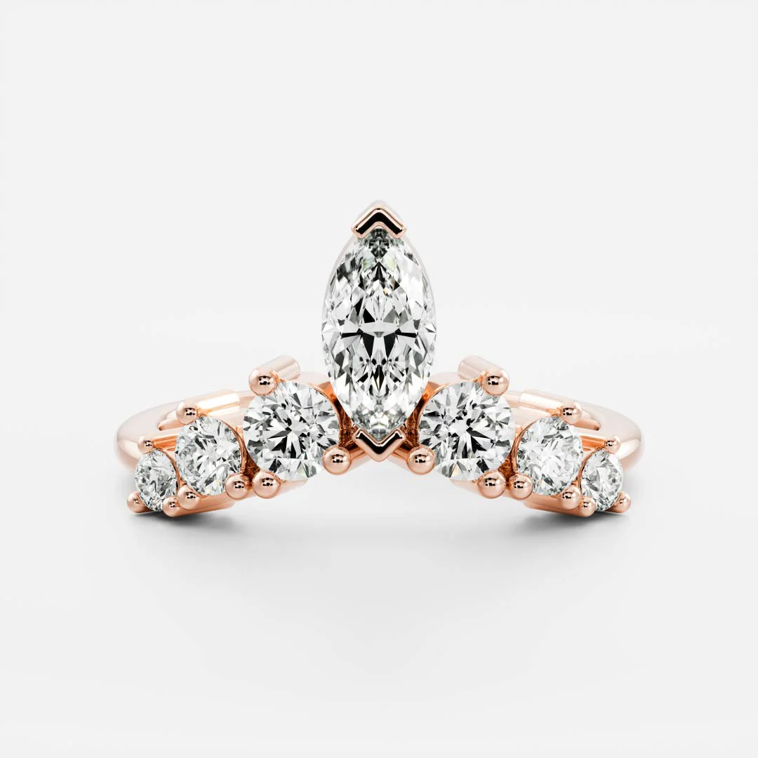 Elegant and ornate, The Diana Ring is a beautiful wedding band, lined with round brilliant cut cultured gemstones, leading to a central marquise cut moissanite in the perfect crown shape.