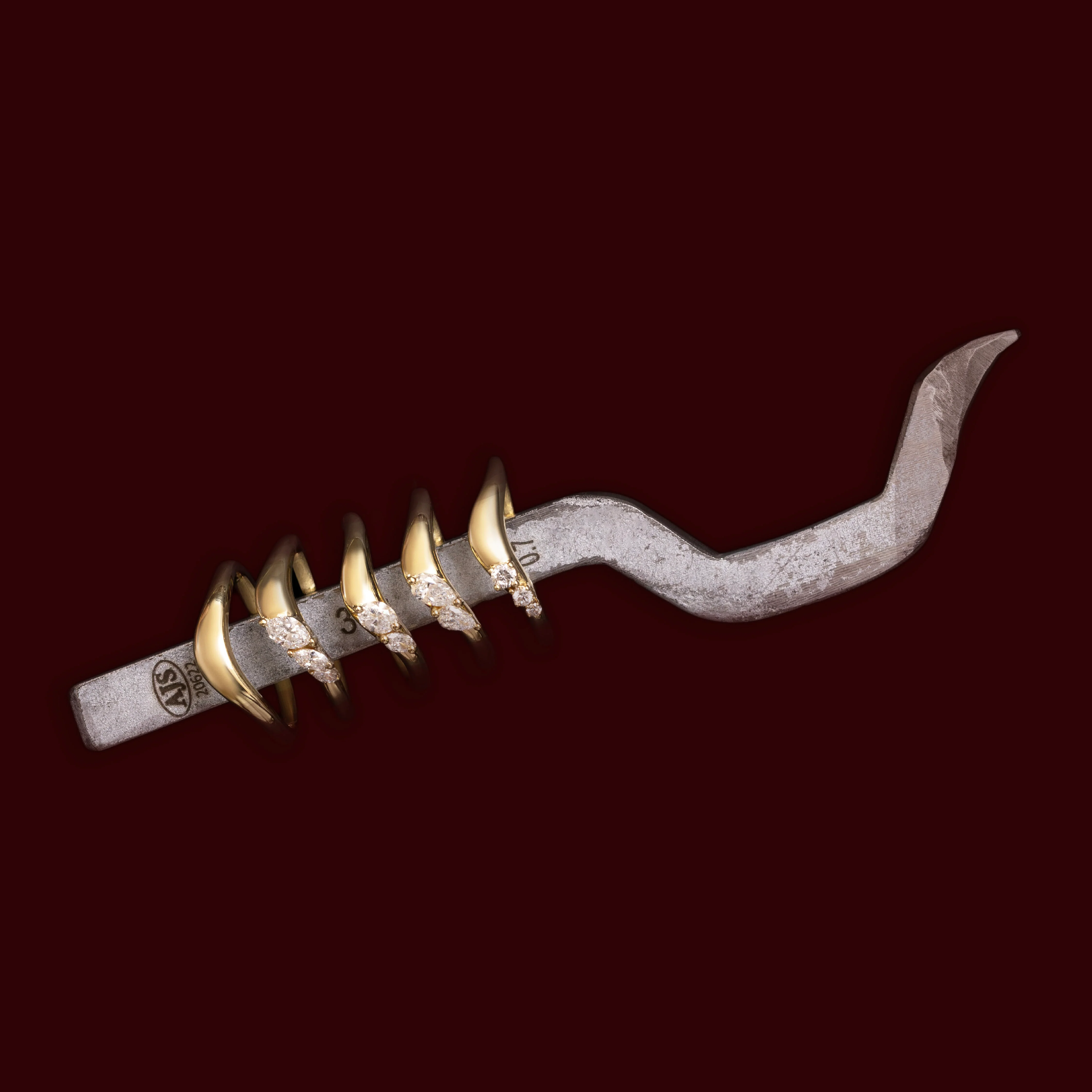 The Eve Ring boasts an organically curved band adorned with two intricately placed oval accent stones. As a play of depth, this design tapers from 4mm to 1.8mm in a fluid wave design.