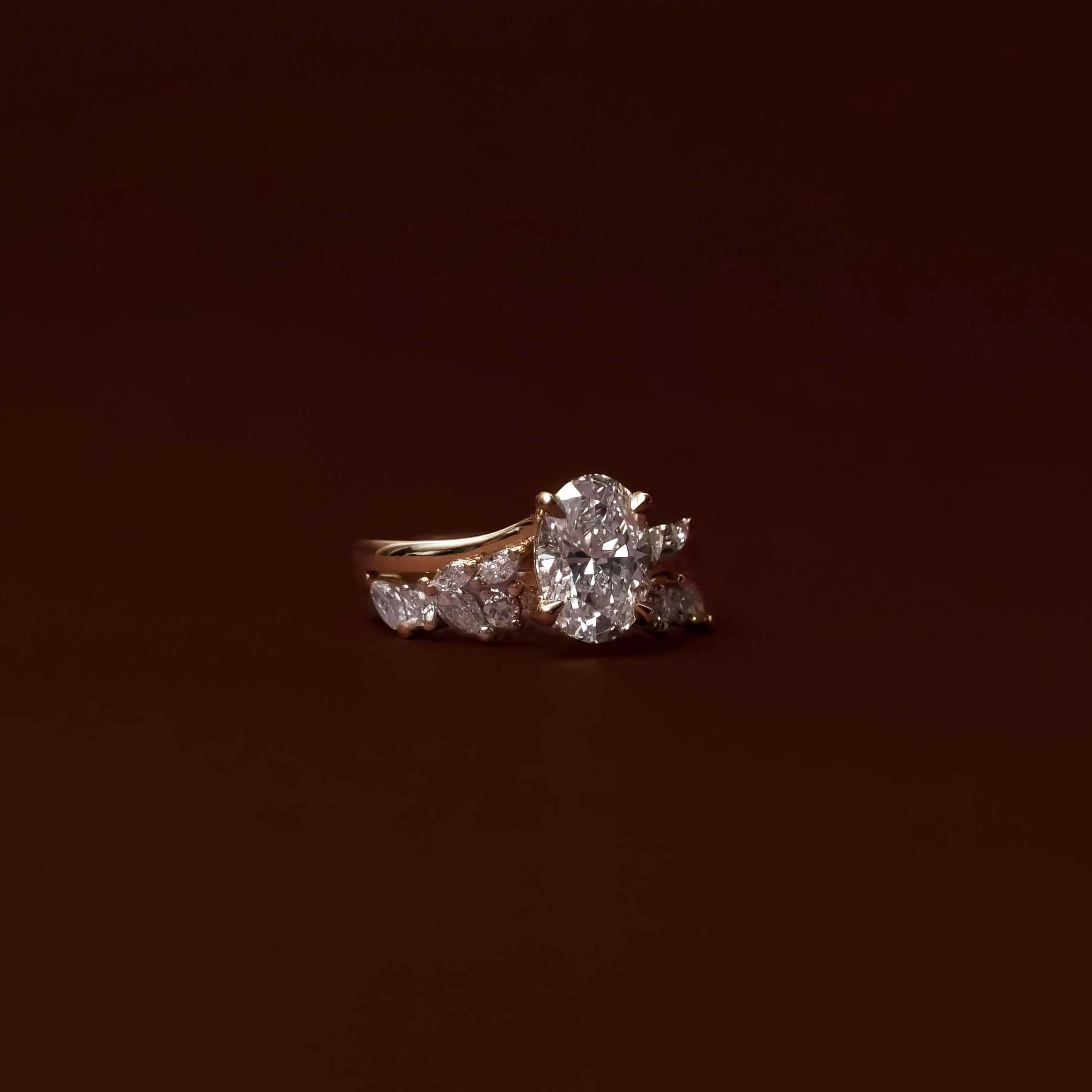 A delicate arrangement of marquise and round brilliant cut gemstones meticulously set side by side to create a mesmerising and intricate pattern.