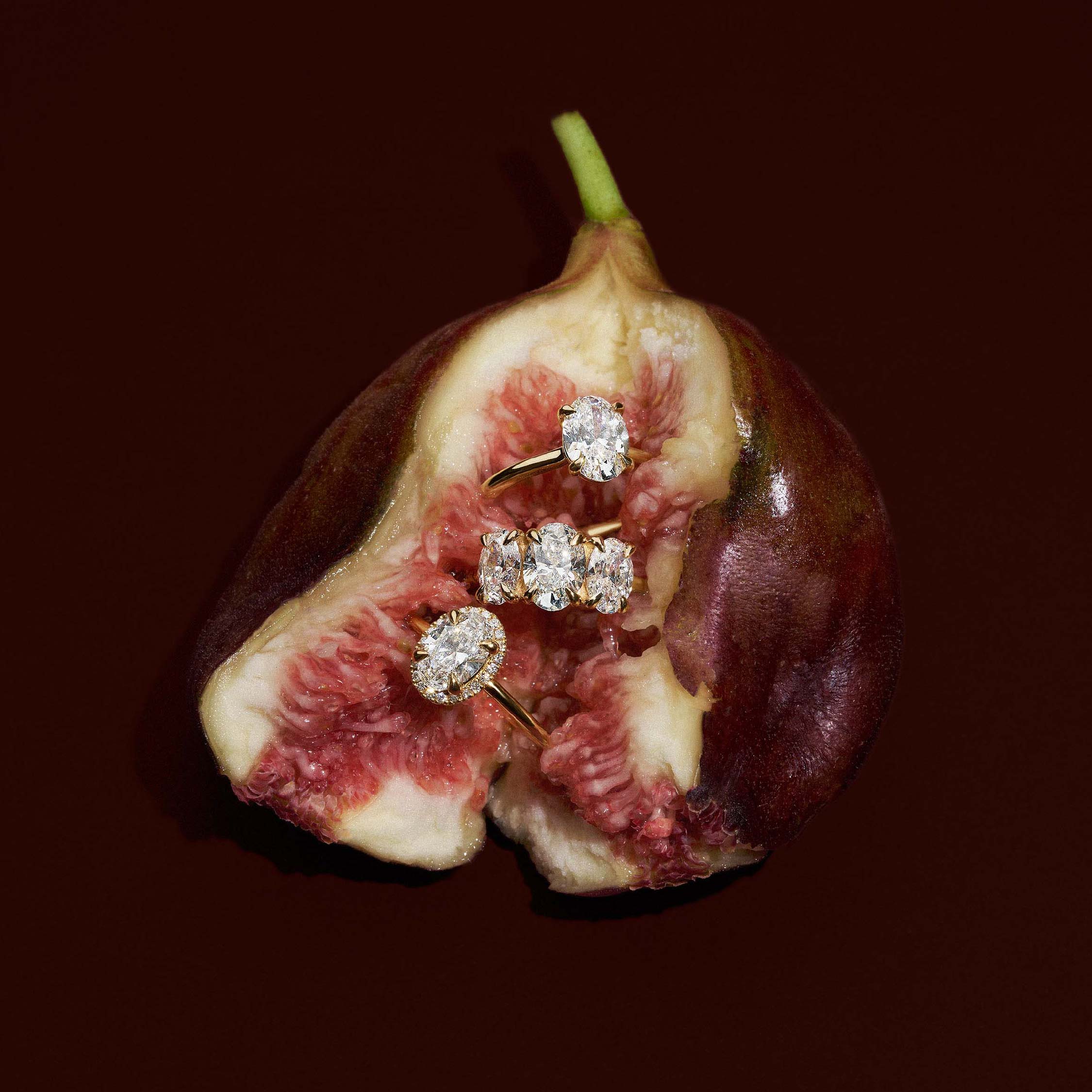 Pictured: The Odette Ring is styled with The Classic Domed Ceremonial Ring and The Genevieve Ring - Horizontal Oval Wedding Band (image one).
