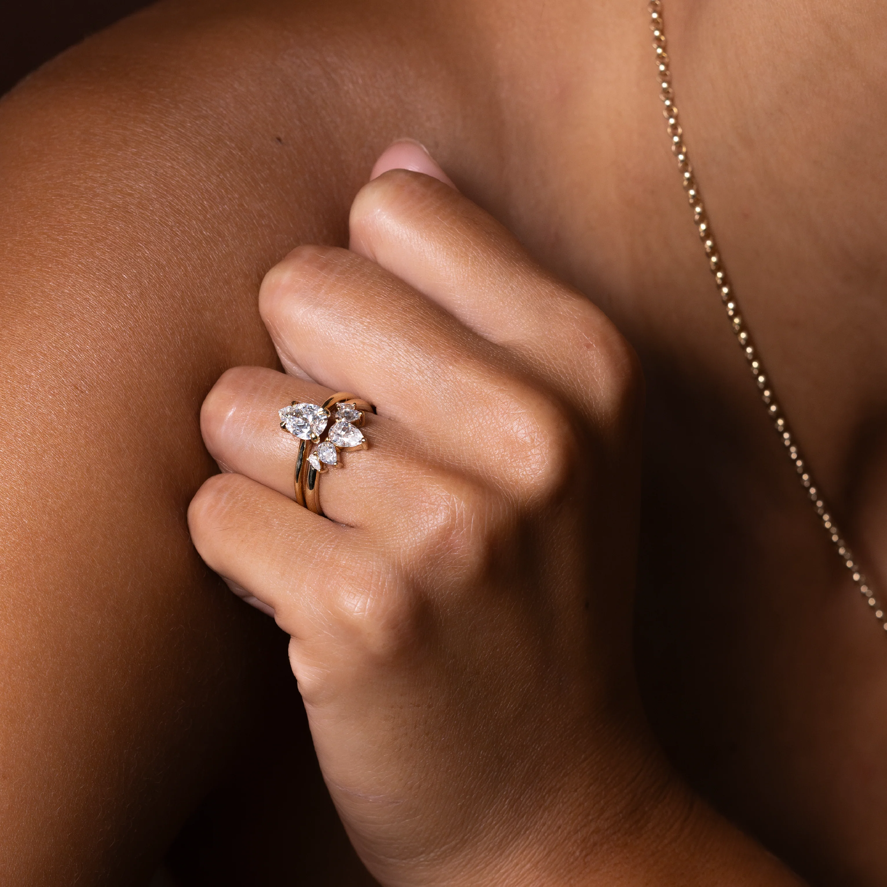 Pictured: The Sophia Ring is styled with The Lucie Ring - Horizontal Pear Wedding Band and The Ava Ring - Pavé Wedding Band (image one), The Eleanor Ring - Crown Wedding Band (image two), and The Grace Ring - Crown Wedding Band (image three).